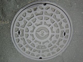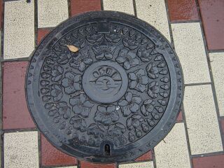 茨城県★筑西市(下館市) 真ん中に市章。 下館市のシ、モ、ダ、テを組み合わせて産業都市としての「槌」「宝」を中心に配し、市の発展を表徴したもの。 市の花(バラ)、市の木(桜)が周りに描かれているように見える。 TOP BACK