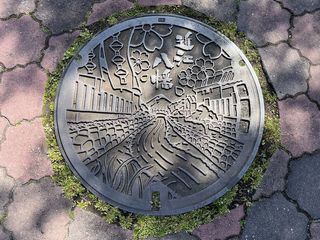 八幡堀の両側に白壁の蔵の風景と奥には八幡山。近江商人のそろばん玉の柄の暖簾と市の木・サクラ。